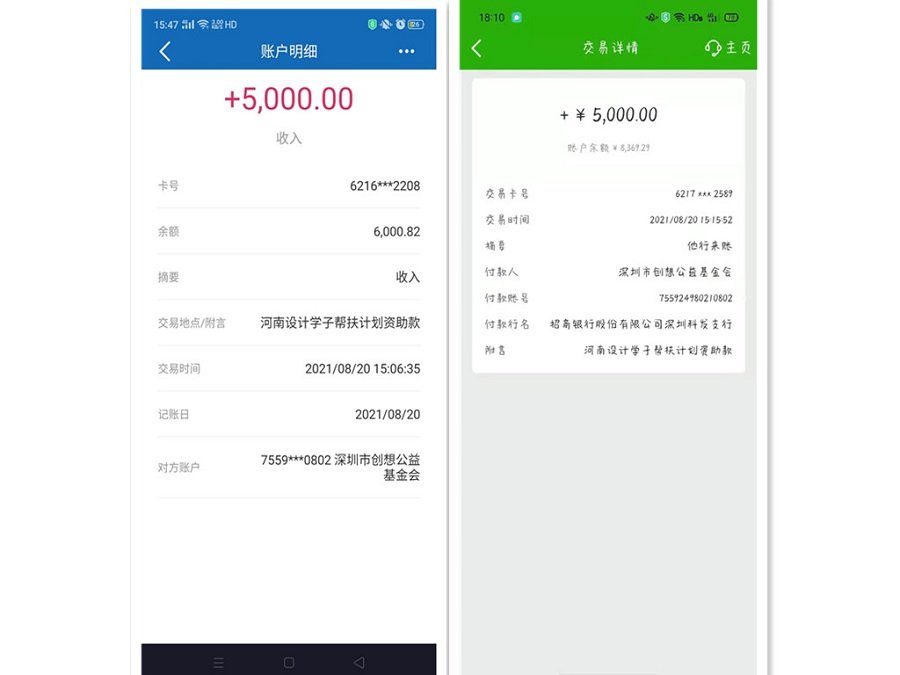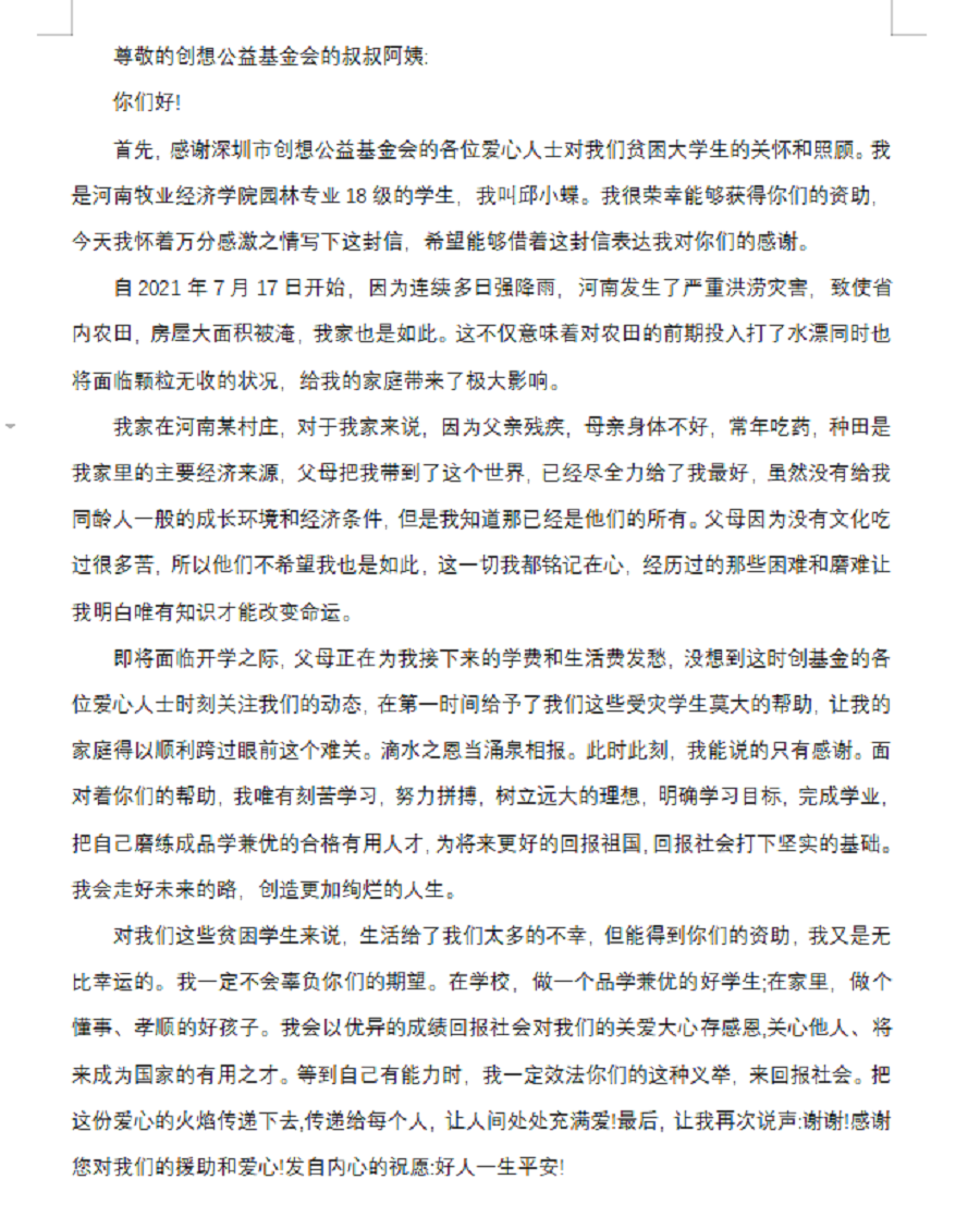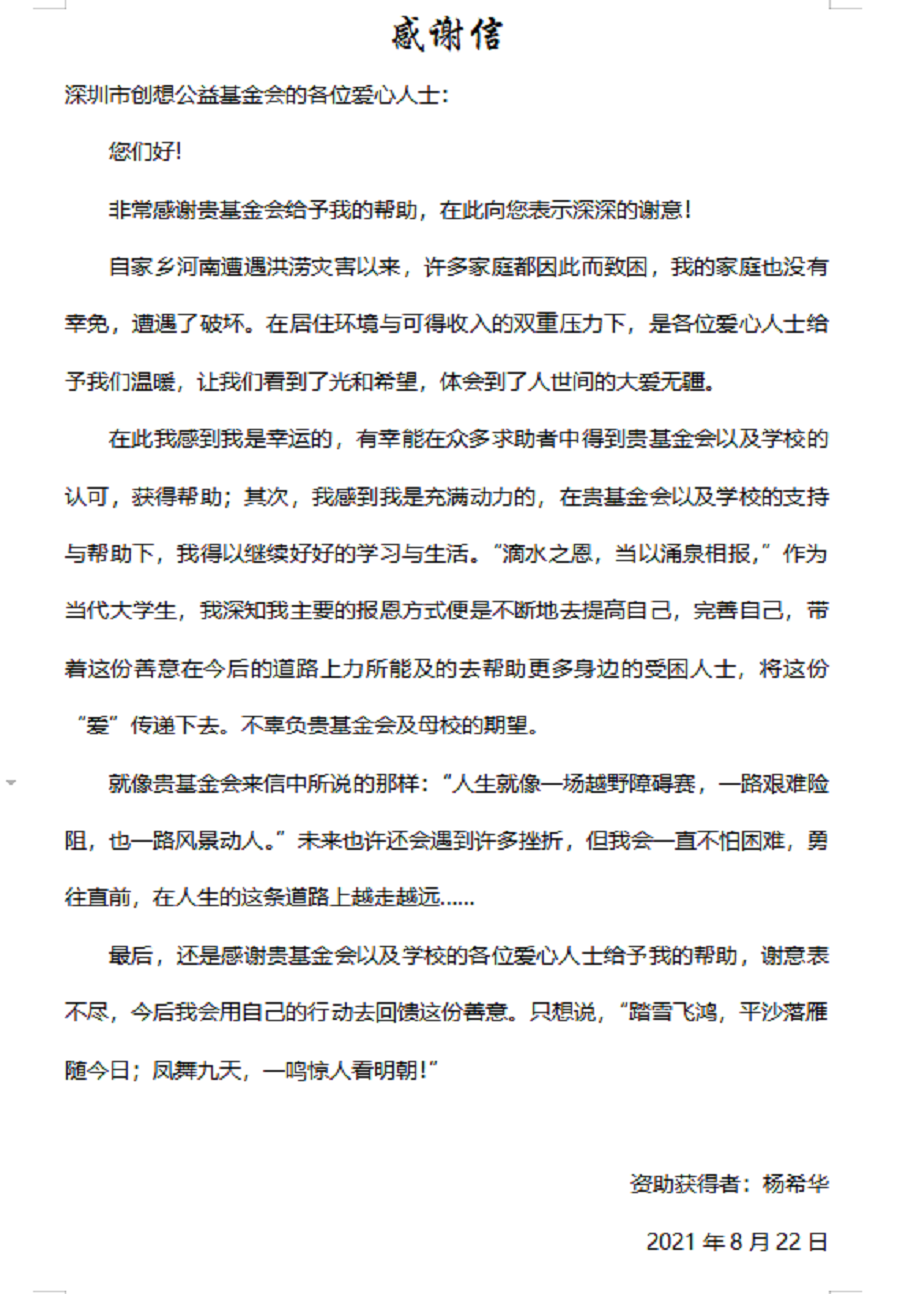 今年暑假,我省部分地区遭受严重的洪涝灾害,为了让受灾员工安心继续学业,best365足球官网和弘雅书院积极联系了深圳市创想公益基金会,发起了“河南设计学子帮扶计划”,努力联系受灾员工、配合基金会,为员工争取到最大的补助,帮助更多的同学度过眼前的难关。best365足球官网18园林01邱小蝶、19园林01杨希华两名同学获得了每人5000元的资助。