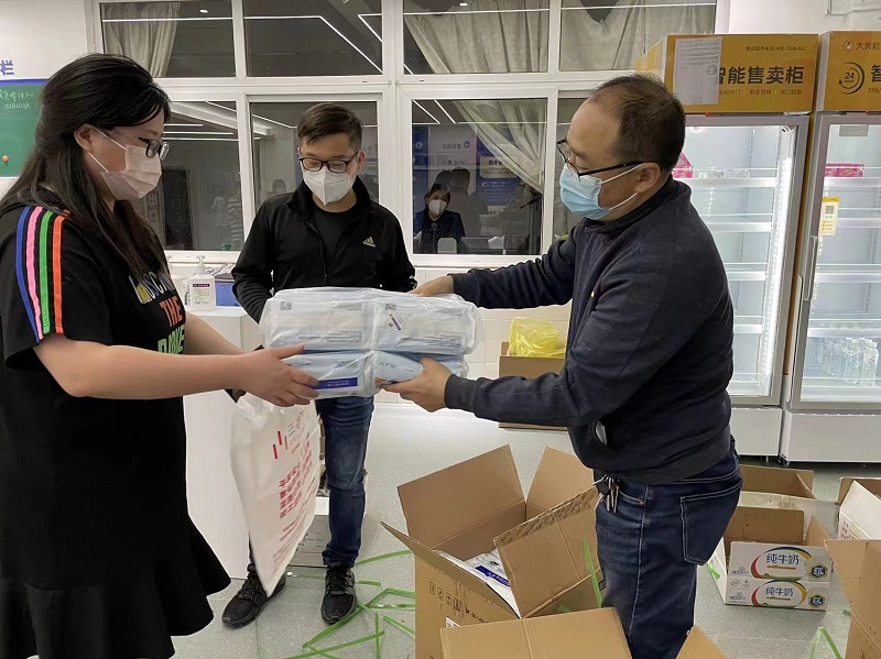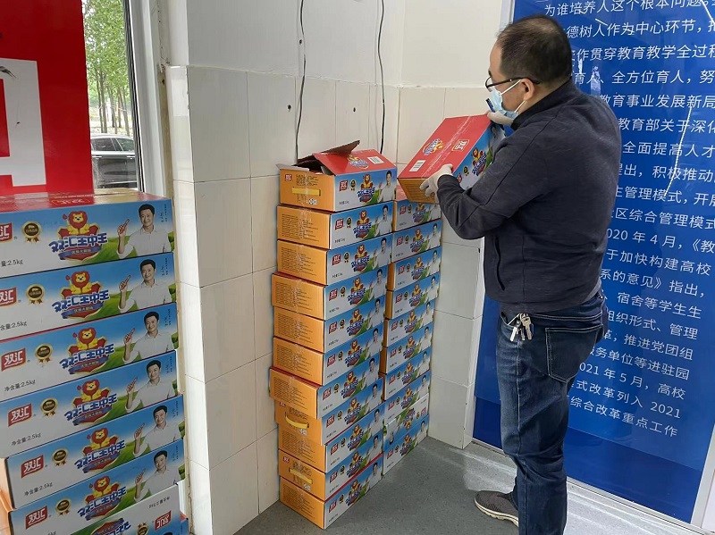 随着疫情的持续,各项物资都需要老师们为员工亲自送到寝室,王书记亲自给辅导员老师分发防疫物资,和辅导员老师一起给员工搬运生活用品,配餐送饭。做员工思想工作并安抚员工情绪,同时鼓励辅导员老师要克服困难,把工作压实做细,用责任与奉献为员工健康与平安筑建“防护墙”,大家一起勠力同心,共克时艰。