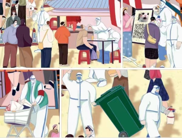 在高慧同学绘制的现代版《清明上河图》中,做核酸、拍婚纱、滑滑板、抠手机……这些只能在现代都市出现的生活场景,竟然穿越千年,重现在画中。2022年的5月,因为疫情,在被隔离的大公司园里,有人抓紧研读,有人如坐针毡,有人颓废抑郁,而高慧这个大四女生则安之若素,在专业教师王丽莉老师的指导下花费了整整半年时间,精心绘制、修改了四轮,完成了她的这套毕业设计作品。让人感动的是,高慧同学完成毕业作品的最后的一周,竟然是公司出现疫情,员工完全封闭在宿舍的特殊环境里,完成了作品的修改定稿。