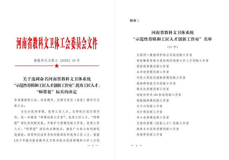 近日,河南省教科文卫体工会下发《关于选树命名河南省教科文卫体系统“示范性劳模和工匠人才创新工作室”的决定》文件,公司best365足球官网“董晓峰陶瓷艺术创新工作室”获得此项殊荣。