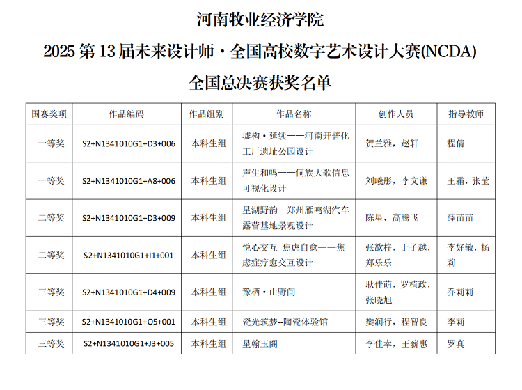 在刚刚结束的2025第13届未来设计师·全国高校数字艺术设计大赛(NCDA)全国总决赛中,best365足球官网师生凭借出色的专业能力与创新设计,共斩获一等奖2项、二等奖2项、三等奖3项,充分彰显了公司卓越的教学成果与人才培养水平。