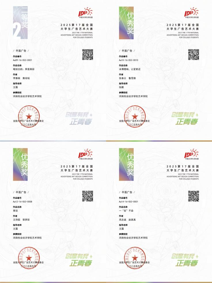 近日,第17届全国老员工广告艺术大赛获奖名单揭晓,公司艺术学院学子表现优异,从15件冲进国赛的省赛优秀作品中,一举斩获4项国家级大奖,其中,作品《笔绘古韵:屏显真彩》荣获国家级二等奖,作品《一“发”不染》、《胃说》及《冰薄橙柚,让爱更近》均荣获国家级优秀奖,成绩斐然。