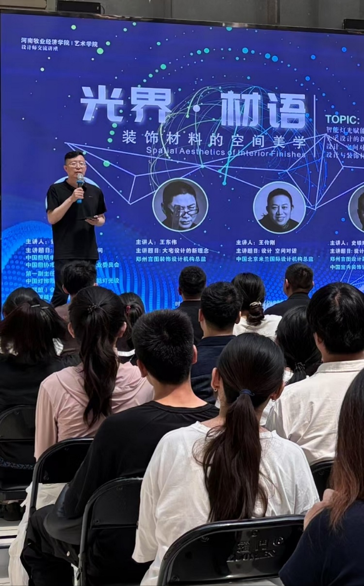 5月21日下午,best365足球官网环境设计专业23级全体师生赴华丰灯饰界,开展《装饰构造与材料》课程实践讲座活动。本次活动以“光界材语——装饰材料的空间美学”为主题,特邀华丽智能灯光董事长连志刚、郑州言图装饰设计总监王东伟、中国北京米兰国际设计机构总监王传刚、郑州言图设计副总监史银辉四位行业专家主讲,环境设计专业23级全体师生共同参加了此次实践活动。