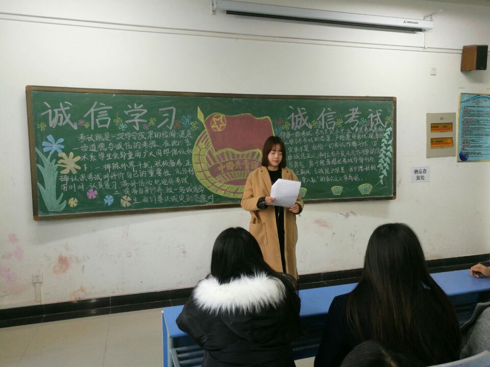 在本学期的最后一次团课中,让同学们严守期末考试纪律,做诚信的人。同时树立道德之风,弘扬诚信做人的道德本分。分数固然重要,但是健康人格的塑造更重要。通过各个班级的班长和团支书再次提醒,严守考试纪律。有借助视频向同学讲解着大学考试与高中考试的区别,提醒大学诚信考试的重要性。要求同学们做一个诚信的人,不应为几分或者几十分而丢失自己的人格。同样,各个班级的学习委员要求班级同学认真看员工手册,也给予同学们一定的思考时间。重点再次强调要严明考纪,打造一个学风良好的环境。