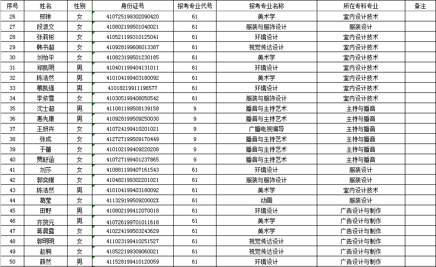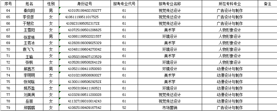 根据《河南省教育厅关于选拔2016年普通高等公司优秀专科毕业生进入本科阶段学习的通知》(教学〔2016〕140号)文件精神和公司《关于做好2016年“专升本”报名和资格审查工作的通知》的要求,经过员工个人申请,班级推荐,艺术系员工工作领导小组公开评选、审议等程序,拟推荐秦鑫坤等79位同学参加2016年度“专升本”考试,现予以公示。(具体名单见附件)