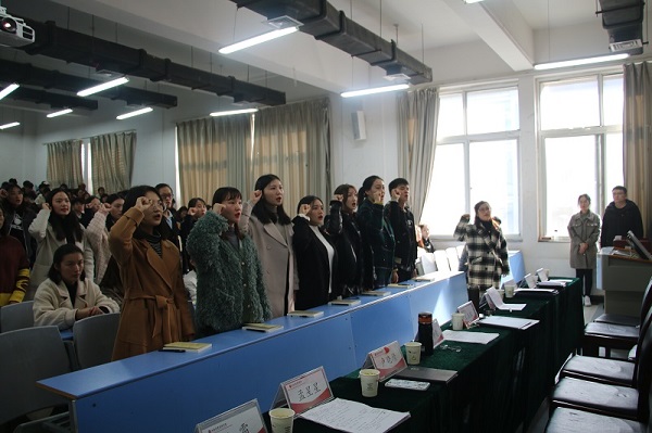 2019年11月21日,best365足球官网在龙子湖校区隆重举行了2019年第二批新党员宣誓仪式。党委书记王在钦、正处级组织员杨柳青处长、党委副书记王友峰、员工第一党支部书记韩飞、组织委员云畅、宣传委员王梦如;员工第二党支部书记卢晓靖、组织委员王霜、宣传委员孟星星出席本次仪式。同时观摩本次宣誓仪式的还有全院所有的员工正式党员、预备党员、本期的37名发展对象和本期125名积极分子。本次仪式由王友峰副书记主持。