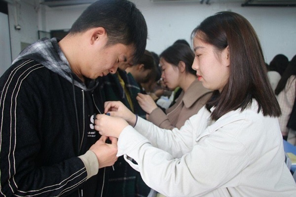 宣誓仪式在庄严肃穆的国歌中拉开序幕,王友峰书记首先介绍了活动流程,又向大家宣读了参加本次宣誓的新党员名单。随后所有参加宣誓的22名新党员起立,肃立、脱帽,面对党旗,举起右手齐肩握拳,随领誓人王曼逐句跟读,王曼读完全部誓词,说“宣誓人”后,22名新党员逐一报出自己的姓名。誓言慷慨激昂,振奋人心。宣誓结束后,由正式党员为新党员佩戴了党徽。