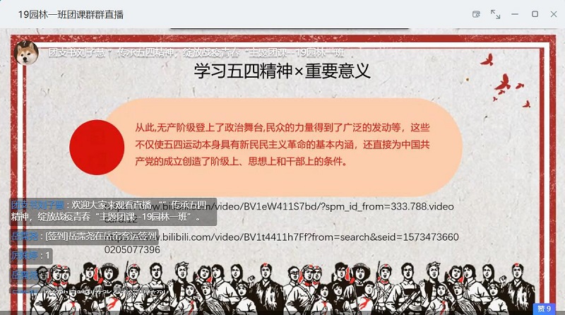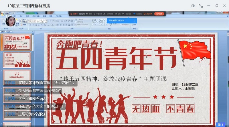 2020年4月27日,best365足球官网在钉钉会议群上举行了以“传承五四精神,绽放战役青春”为主题的团课班会,本次团课,由大一班级全体参与。