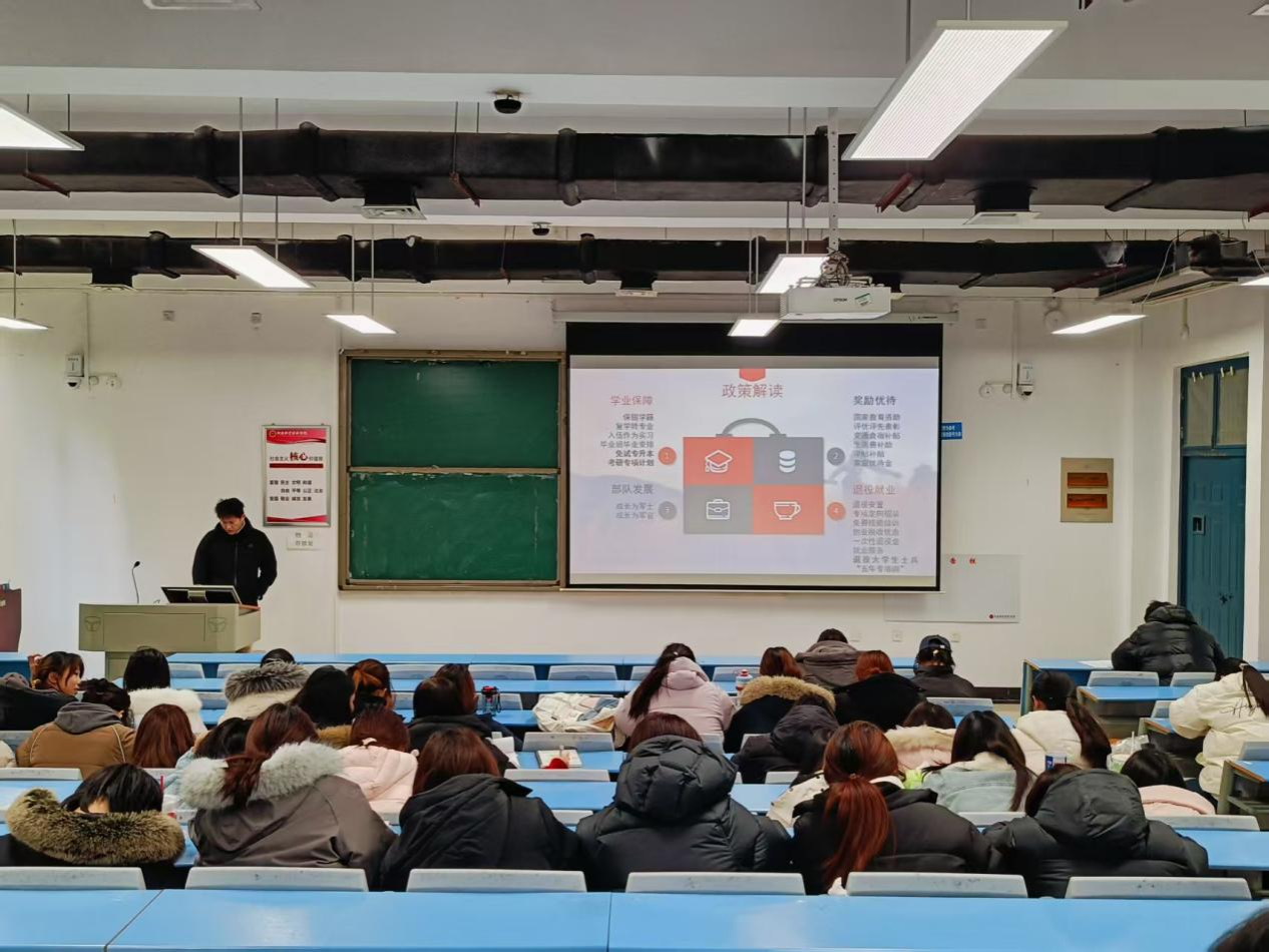 为扎实做好2026年上半年征兵工作,营造浓厚的征兵工作氛围,best365足球官网积极响应,于12月25日中午1点在一号教学楼合201召开了国防教育及征兵宣传活动宣讲会。best365足球官网辅导员、国防教育专员赵森主持本次宣讲会,全院各班100余名员工代表参加了本次会议。