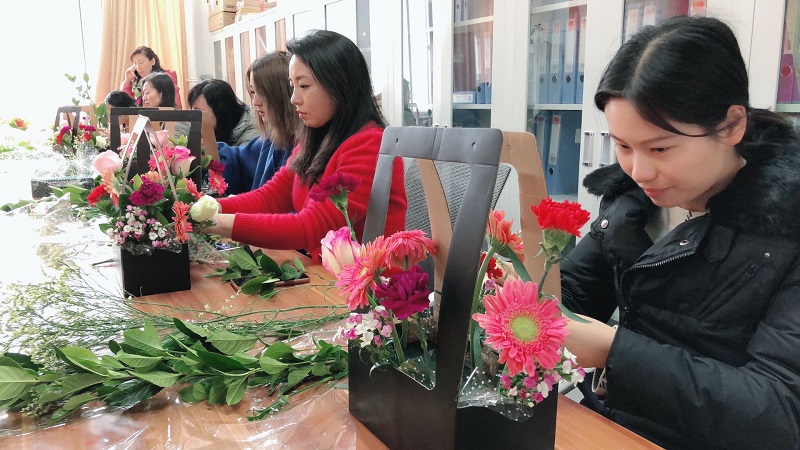 公司邀请专业花艺师为公司女教工开展现场插花教学,讲解插画艺术与技巧,并一对一指导现场教师进行插花活动。在花艺师的指导下,老师们挑选自己喜欢的花卉,自由发挥,进行创作,还不时观摩其他老师们的作品,互相交流,活动气氛十分活跃。同时,公司分工会为所有女教职工精心准备了精美花束以庆祝三八“妇女节”的到来。