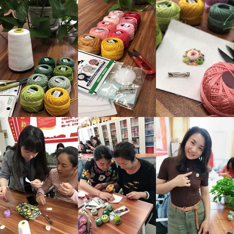 刘雷老师一边讲一边画,向大家详细讲解和示范了刺绣胸针的制作步骤、制作要点以及基本的配色方法,并现场进行实践教学。在刘雷老师手把手的悉心教授和指导下,大家飞针引线,细心缝制,互相学习,增加了交流,拉近了距离,在欢声笑语中驱散了工作的疲劳,释放了压力。经过近两个小时的制作,一个个漂亮、精致的胸针在大家的巧手下“新鲜出炉”。